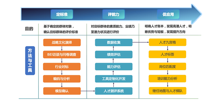 人才盤(pán)點(diǎn)共分為“定標(biāo)準(zhǔn)一評(píng)能力一促應(yīng)用〞三大步驟,建立符合企業(yè)和崗位要求的評(píng)價(jià)標(biāo)準(zhǔn)后,用科學(xué)