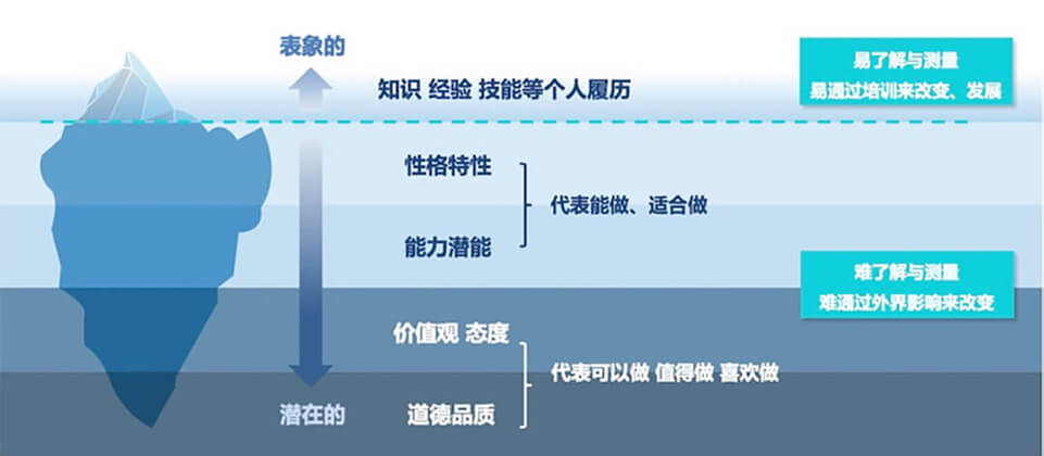 冰山中水平面以上的是門檻性素質(zhì),這只是對勝任者的基本要求,它不能把表現(xiàn)優(yōu)異者與表現(xiàn)平平者區(qū)別開來。